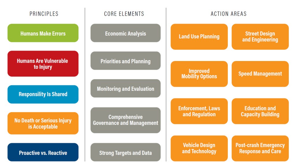 Safe System Approach memiliki 4 elemen utama, yaitu perencanan, pelaksanaan, monitoring dan evaluasi. Elemen ini termasuk menyusun target yang terukur, analisis ekonomi terhadap benefit peningkatan keselamatan, identifikasi prioritas, kepemimpinan dalam pengelolaan keselamatan, evaluasi berbasis data, dan pengarusutamaan keselamatan dalam setiap tahapan pembangunan.