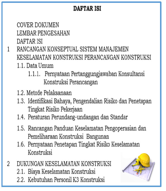 Apa bedanya perencanaan dan perancangan? Di tahap perancangan sudah muncul Detailed Engineering Design (DED) dan estimasi harganya. Di sini harus disusun dokumen RKK Perancangan yang tentunya lebih detil dari rancangan konseptual SMKK. Isinya antara lain pernyataan pertanggungjawaban, metode pelaksanaan, identifikasi bahaya, pengendalian risiko dan penetapan risiko pekerjaan, rancangan panduan keselamatan, biaya keselamatan dan kebutuhan personil, seperti daftar isi di bawah ini.