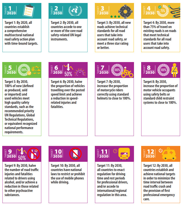 Pada bulan Mei tahun 2016, the World Health Assembly (WHA) meminta the World Health Organization (WHO) berkolaborasi dengan United Nations (UN) dan UNRSC, untuk memfasilitasi para pemangku kepentingan untuk mengembangkan target kinerja global sukarela untuk mengurangi tingkat fatalitas akibat kecelakaan lalu lintas. Kesepakatan terkait target ini baru didapatkan saat rapat WHO tanggal 20-21 November di Jenewa. Target yang dimaksud adalah: