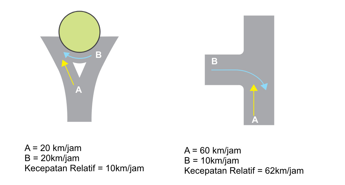 - Kecepatan relatif antar kendaran yang rendah. Kecepatan kendaraan yang memasuki simpang sangat berpengaruh terhadap tingkat keparahan apabila terjadi tabrakan. Sebagai contoh, apabila ada dua kendaraan dimana kendaraan pertama melaju dengan kecepatan 60 km/jam, dan kendaran lain melaju dengan kecepatan 10 km/jam pada simpang dengan sudut 90 derajat, maka kecepatan relatif yang ditimbulkan adalah 62 km/jam (lihat gambar di bawah), sehingga apabila terjadi tabrakan maka dampaknya akan sangat fatal. Ini berbeda dengan bentuk simpang bundaran, dimana kecepatan kendaraan dipaksa untuk melambat sehingga kecepatan relatifnya pun ikut menurun.