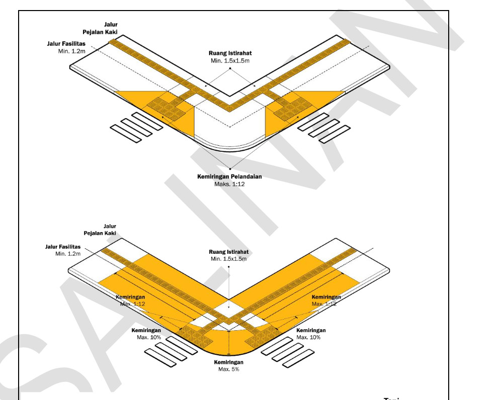 9. Penyediaan kebutuhan seluruh pengguna jalan, baik pengendara maupun pejalan kaki dan pesepeda. Seringkali simpang tidak hanya digunakan oleh mobil, namun juga oleh pejalan kaki, pesepeda dan pengguna jalan berkebutuhan khusus. Bentuk simpang harus diatur sedemikian rupa agar dapat mengakomodir kebutuhan seluruh pengguna, seperti contoh penyediaan ramp di bawah ini.