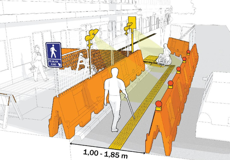 Selain itu, pedoman ini juga menjelaskan fasilitas pejalan kaki sementara pada areal konstruksi yang selama ini belum mendapat perhatian yang cukup. Beberapa ketentuan yang harus diperhatikan antara lain, lebar minimal 1.85 m, pemisahan fasilitas pejalan kaki, perambuan yang memadai, pencahayaan yang cukup, dan fasilitas bagi pejalan kaki berkebutuhan khusus termasuk ramp yang memenuhi syarat seperti contoh di bawah ini.