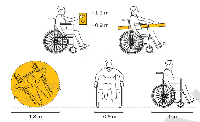Pedoman ini merupakan revisi terhadap Pedoman Pd 03 2017 B tentang Perencanaan Teknis Fasilitas Pajalan Kaki dengan menyempurnakan unsur inklusivitas bagi warga kelompok rentan, penyandang disabilitas, lansia, anak-anak dan perempuan. Salah satu contohnya adalah penyediaan ruang gerak untuk pengguna kursi roda sebagaimana contoh gambar di bawah ini.
