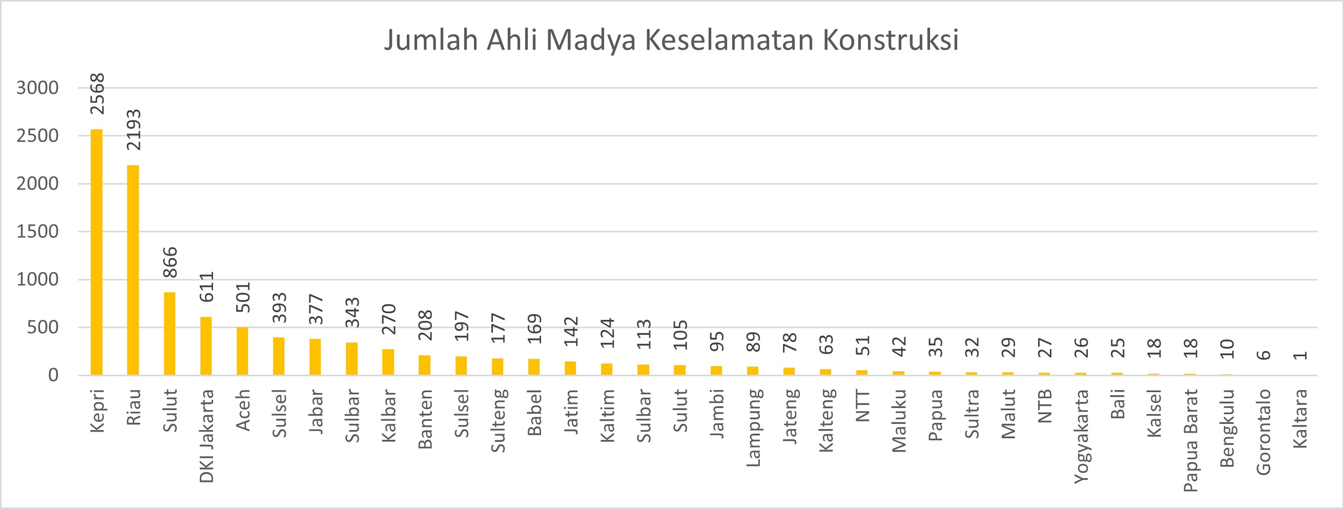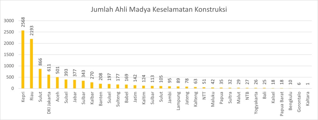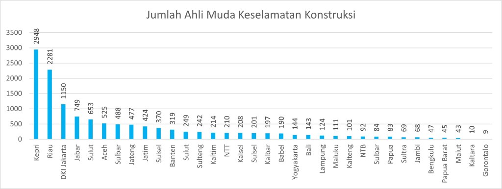 Indonesia memiliki total 13.268 Ahli Muda Keselamatan Konstruksi dengan Provinsi Kepri menempati jumlah terbanyak dengan hampir 3000 orang, sedangkan di Gorontalo hanya terdapat 9 orang sebagaimana ditunjukkan pada grafik di bawah ini.
