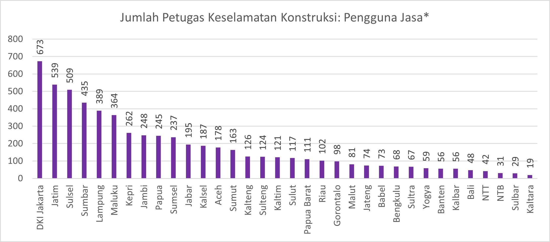 Jumlah Petugas Keselamatan Konstruksi di Indonesia sampai dengan Tahun 2020 mencapai 19.019 orang dimana 6.126 orang dari pengguna jasa dan 12.893 dari penyedia jasa. Jumlah terbesar Petugas KK pengguna jasa ada di Jakarta dengan jumlah 673 orang sedangkan paling sedikit ada di Kaltara dengan hanya 19 orang.