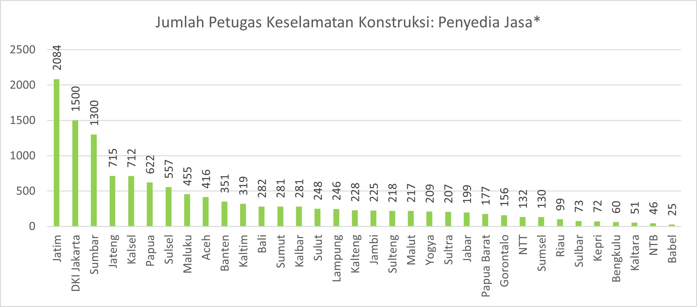 Jumlah petugas keselamatan konstruksi dari sisi penyedia jasa tertinggi ada di Provinsi Jawa Timur dengan lebih dari 2000 orang sedangkan paling sedikit ada di Bangka Belitung dengan jumlah 25 orang.