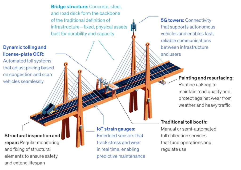 Laporan terbaru “the infrastructure moment” McKinsey (2025) memberikan pesan penting: dunia sudah berubah, dan kita tidak boleh tertinggal. Infrastruktur harus berevolusi dari sekadar aset fisik menjadi infrastruktur berbasis teknologi. Bayangkan sebuah jembatan yang dilengkapi dengan Sensor Pintar (Structural Health Monitoring Systems). Secara sederhana, ini adalah “alat periksa kesehatan” otomatis yang bisa mengirim sinyal jika ada bagian jembatan yang mulai retak atau stres akibat beban berat, sebelum kerusakan itu menjadi bahaya. Inilah yang disebut Smart Infrastructure (Infrastruktur Pintar), yaitu bangunan yang punya “otak” karena bisa mengolah data dan kecerdasan buatan (AI).