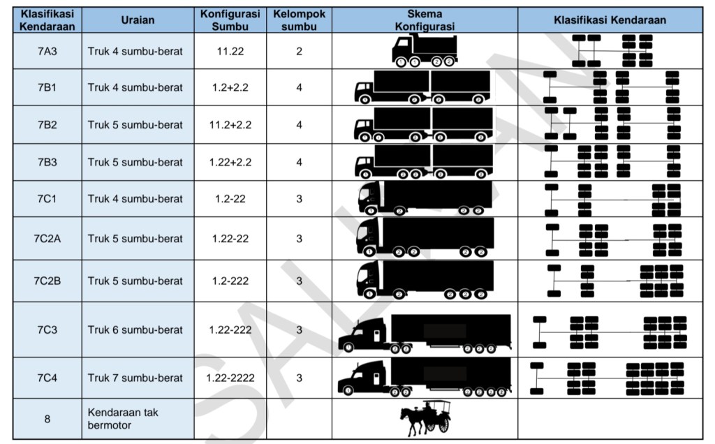 Kalau ditarik dari awal sampai akhir tabel, pesannya jelas. Kendaraan ringan cukup dua sumbu. Kendaraan sedang mulai memperlebar beban dengan ban ganda. Kendaraan berat menambah jumlah sumbu, bahkan membaginya ke beberapa bagian. Semua menuju satu tujuan yang sama: membagi beban agar jalan tidak cepat rusak.
