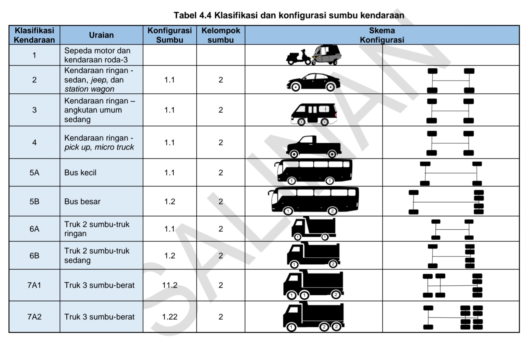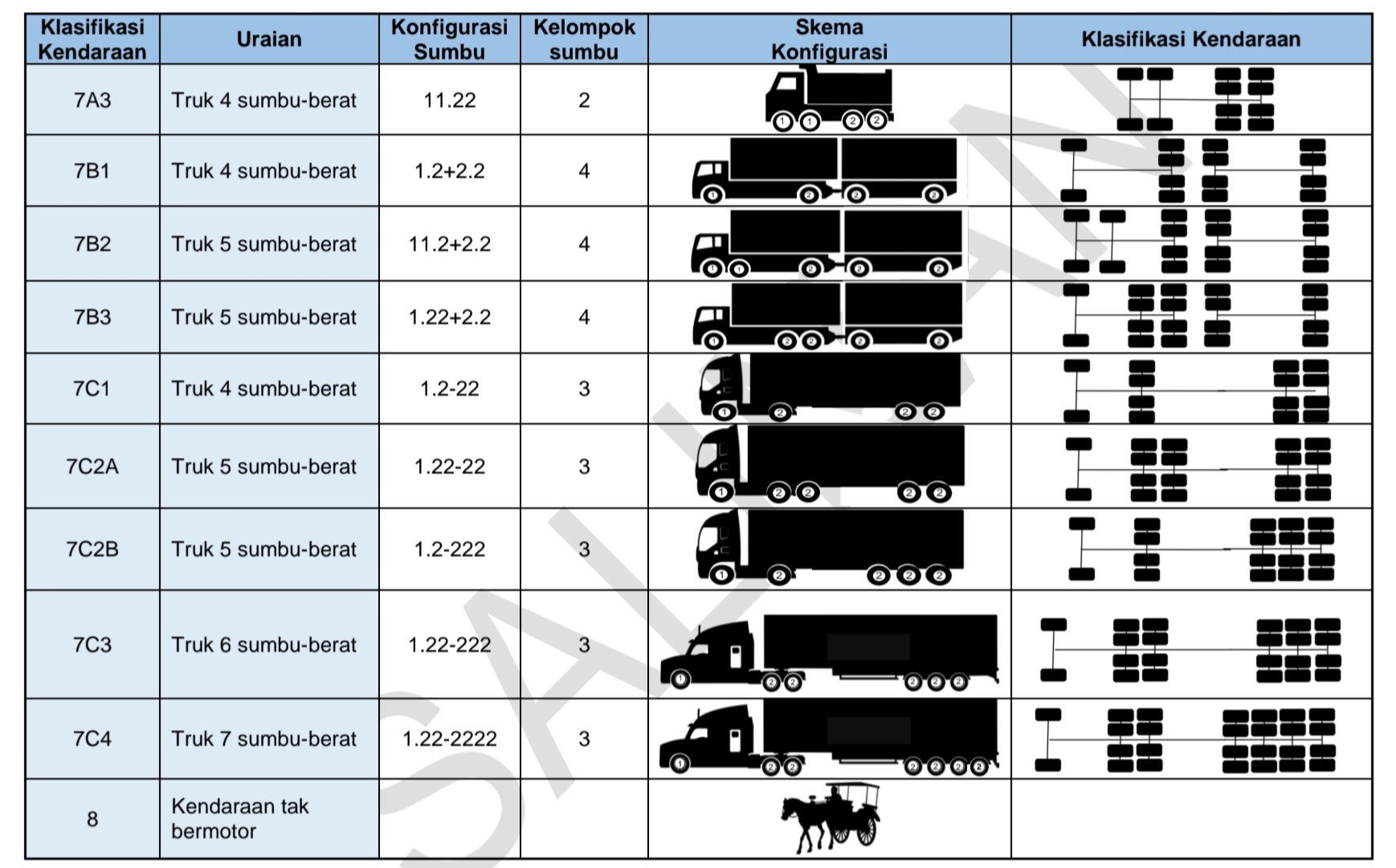 Kalau ditarik dari awal sampai akhir tabel, pesannya jelas. Kendaraan ringan cukup dua sumbu. Kendaraan sedang mulai memperlebar beban dengan ban ganda. Kendaraan berat menambah jumlah sumbu, bahkan membaginya ke beberapa bagian. Semua menuju satu tujuan yang sama: membagi beban agar jalan tidak cepat rusak.